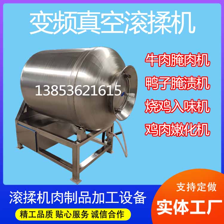 肉制品深加工设备之真空滚揉机,是把原料和腌料混合放在一起进行搅拌,在搅拌的过程当中打开肉的纤维组织,充分把盐水和料水吸收到肉质当中,起到肉质嫩化的作用,平常不加工的肉制品做成熟食后吃起来硬,喍,经过滚揉加工后的肉质嫩化做成成熟食后,吃起来口感好,入味均匀,受到众多客户的青睐,有的烧鸡,烤鸭,炸鸡,卤牛肉,烤肉串,鸡柳,鸡翅,肥肠等等肉制品加工,真空滚揉机在工作一段时间后,需要正常的保养和维护,下面我们着重来说一下真空滚揉机真空泵的保养,在设备初期工作3个月后,需要更换真空泵油,在真空泵工作2-3分钟后停止,倒出真空泵油,加上新真空泵油,加油的时候要观察油位孔,加到油位孔的一半就可以,不要加多或者加少,加多真空泵油容易溢出,加少真空泵油,真空泵工作运行中容易发热,时间久容易烧电机,这是需要特别注意的地方。真空泵油一般根据设备使用情况3-6个月更换一次,20型真空泵油更换一次需要0.6升油,如有不会操作可以联系我公司售后客服,我们会给予指导和解答遇到的问题。